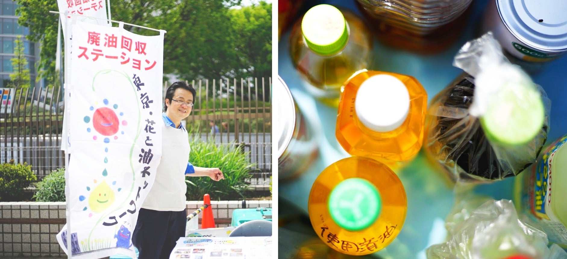 左)鬼沢真之さん、右)自由の森学園高校生たちの環境活動(廃食油回収)