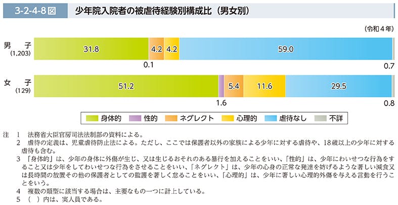 下記に示している通り、犯罪白書では男子では約40%、女子では約70%が何らかの虐待を受けてきています。
