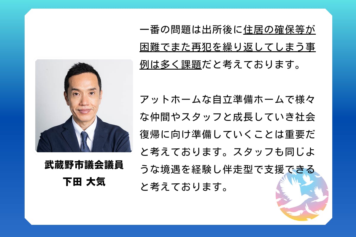私自身の経験からも、少年院や刑務所を出て、社会復帰する上で、安心して暮らし眠れる家があることは、大切なことだと実感してます。これまでの活動で出会ってきた少年たちの中には帰る家がない子たちも多くいたので、私のように帰る家があることは当たり前ではないということに気付きました。