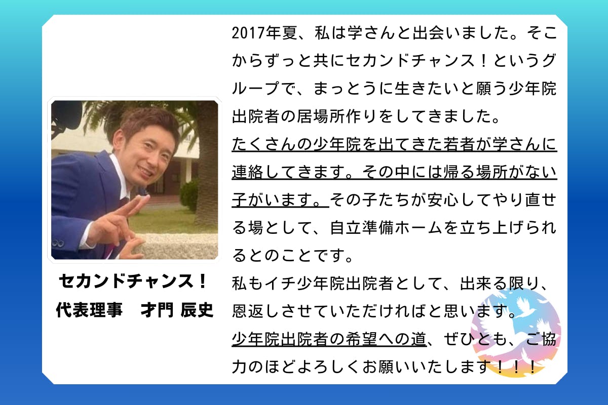 希望ある少年たちの未来を支える自立準備ホームを設立したい! – CAMPFIRE (キャンプファイヤー) (camp-fire.jp)