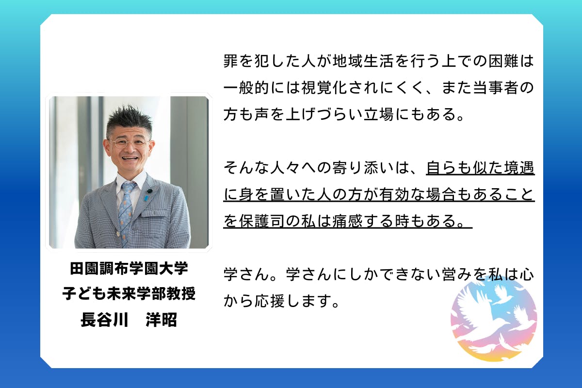 過ちを犯した人にとって、たとえ、ふたたび過ちを犯しても連絡を待ってくれているという存在がどれだけ尊いことか、私自身も少年院出院者なので、その言葉に、ああ、学さんと出会えて良かった。なんだか温かい気持ちになったのを覚えています。